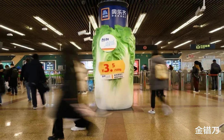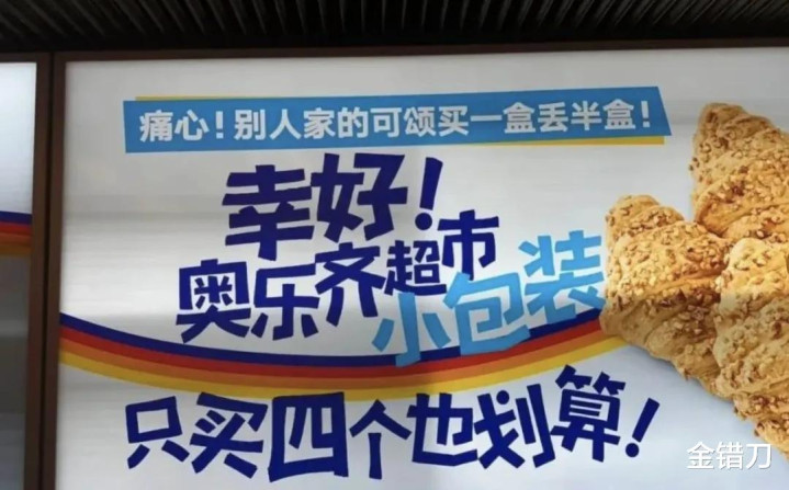 在此之前,奥乐齐还在上海地铁静安寺站上演大型阴阳现场:一边用大字宣传奥乐齐小份更新鲜,一边用小字内涵,逛超市不必买门票。文案上“隔壁家的瑞士卷”“别人家的可颂”,指向性不要太明显。