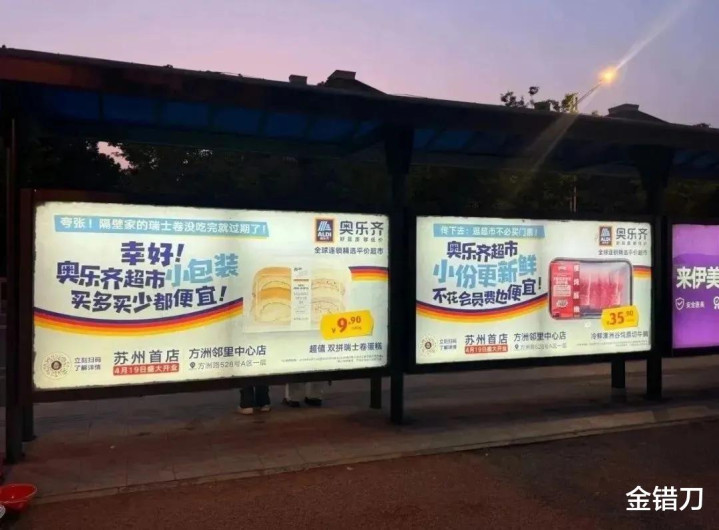 奥乐齐的苏州首站,广告投放位置直接对山姆“骑脸输出”:山姆停车场必经之路的公交站牌上:奥乐齐的广告文案嘲讽值拉满,句句都直戳山姆“软肋”。